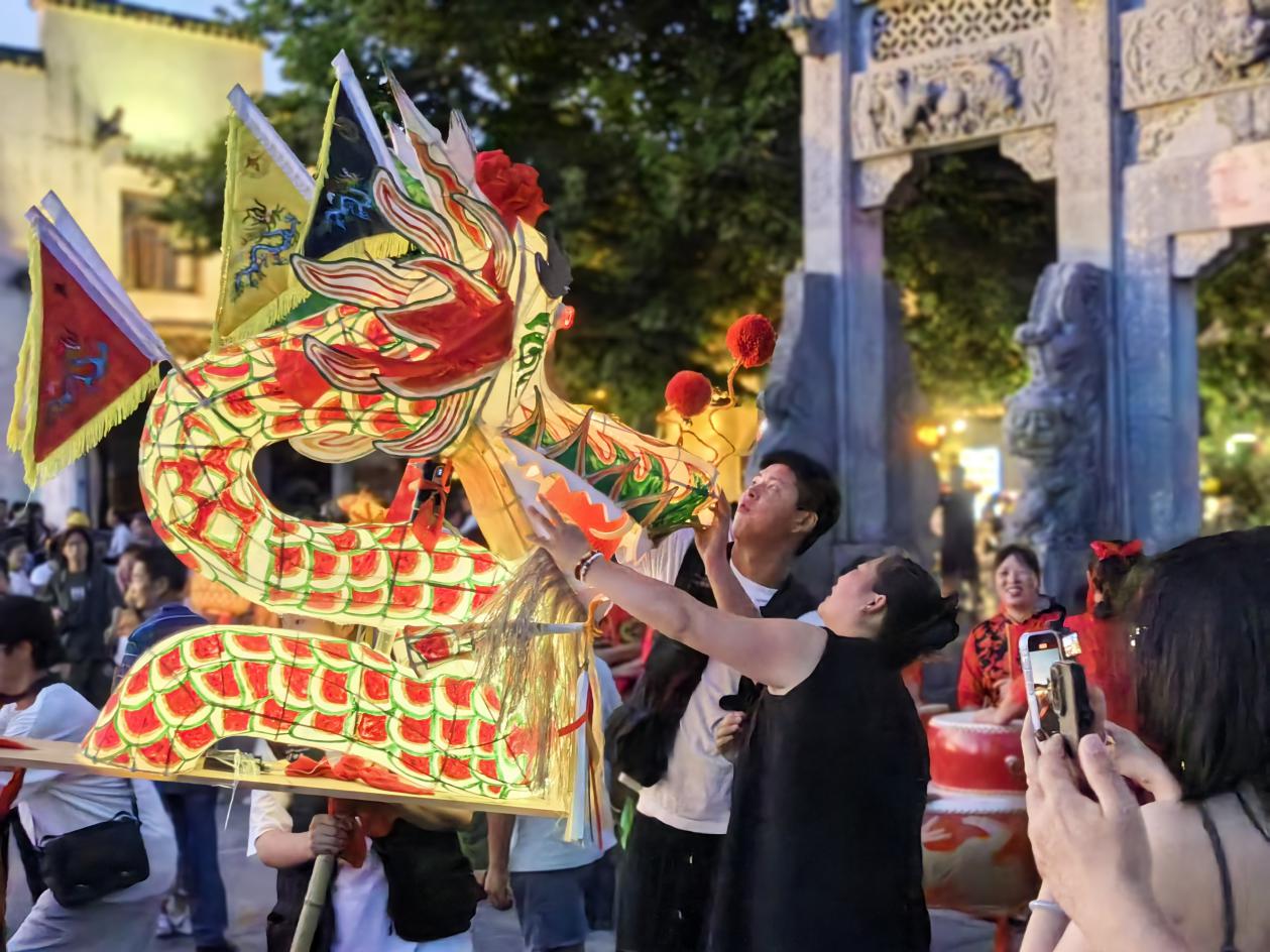 如今,一条由100节板凳串联而成的“长龙”正在西递的青山黛瓦间蜿蜒游走。当百米长的龙身在夜幕中点亮200余盏红灯笼,当年轻志愿者的红马甲与古村马头墙交相辉映,这场持续六百年的非遗盛宴,正以青春之名书写着新时代的精神传奇。当众人齐心协力托举“板凳龙”穿行于西递的古巷,那些镌刻在门楣上的楹联家训,仿佛也在与龙灯的低吟共振,诉说着“作退一步想”的处世哲学,此刻板凳龙上闪耀的灯光便成为流动的文化符号。