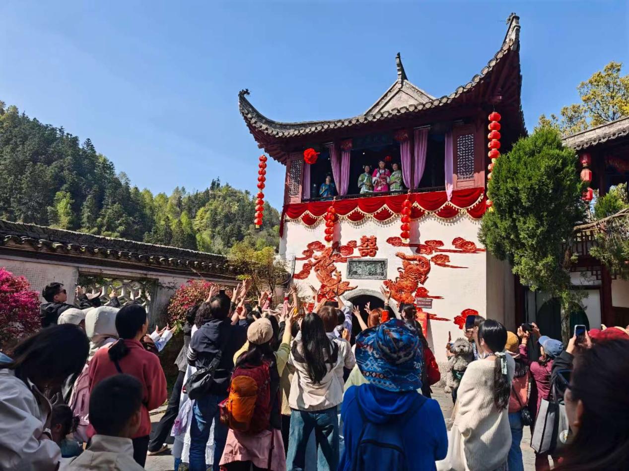 省级非遗“抛绣球”变身集体婚礼:新人们身着传统服饰,在祠堂前宣读“婚事新办承诺书”,以植树纪念替代高额彩礼,用集体宴席取代铺张排场。春节期间,打食桃、写春联、剪窗花等非遗元素融入“乡村春晚”,游客与村民共舞鱼灯、同唱村歌,传统年俗在文明中焕发新生机。
